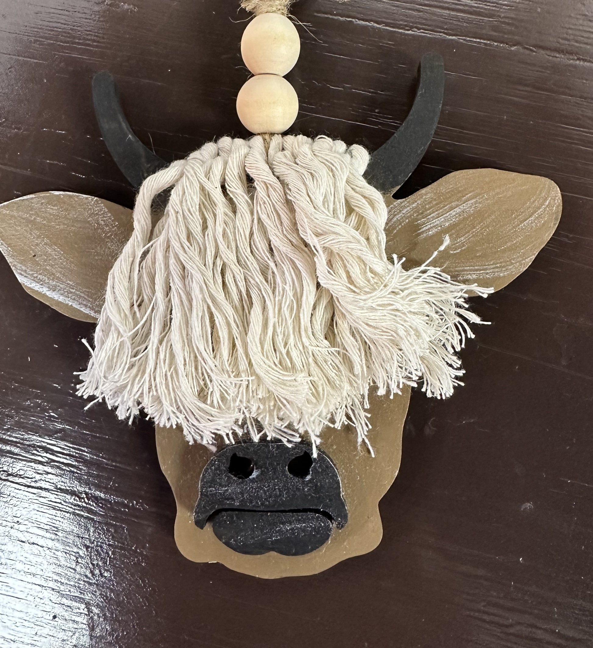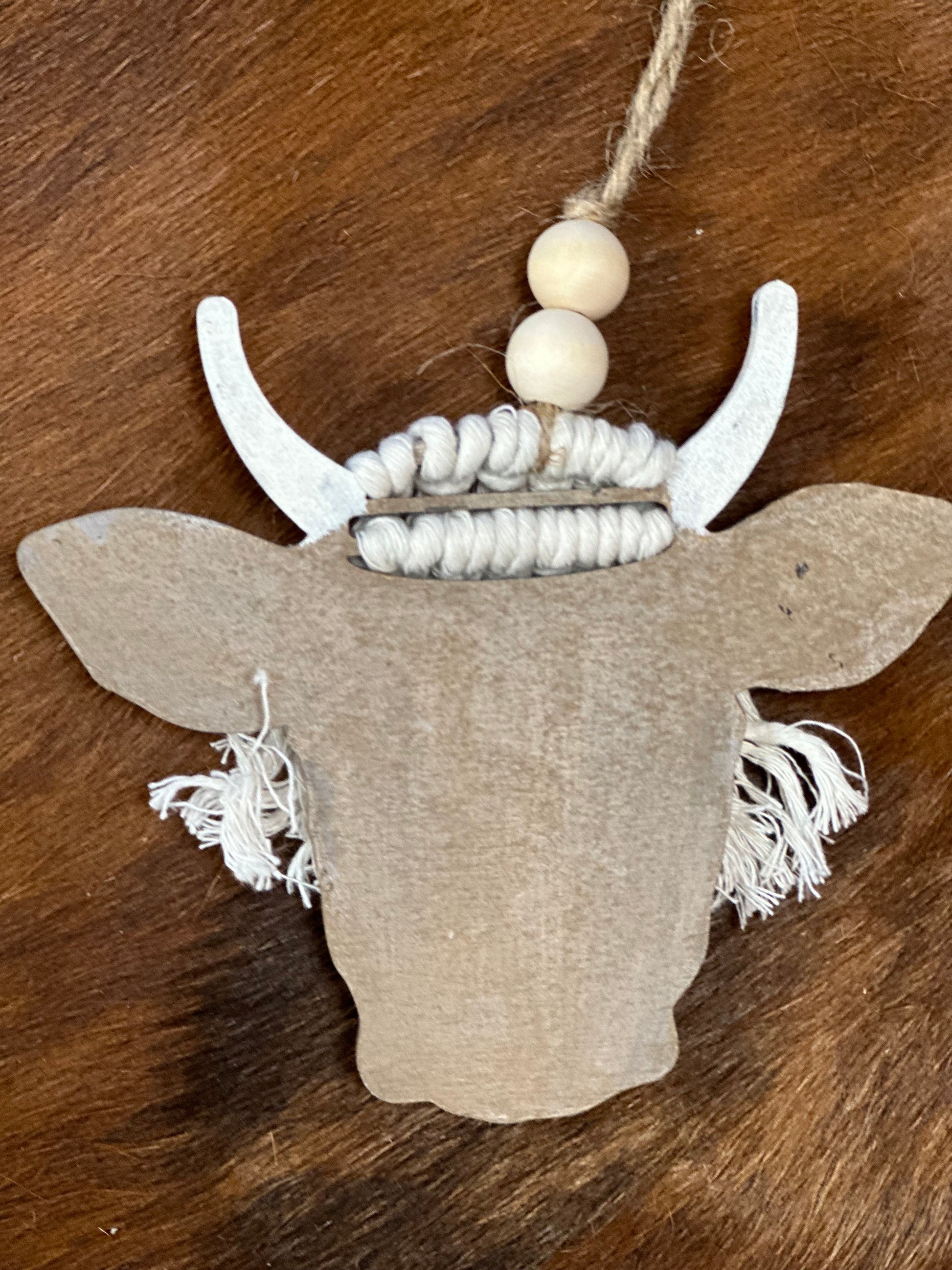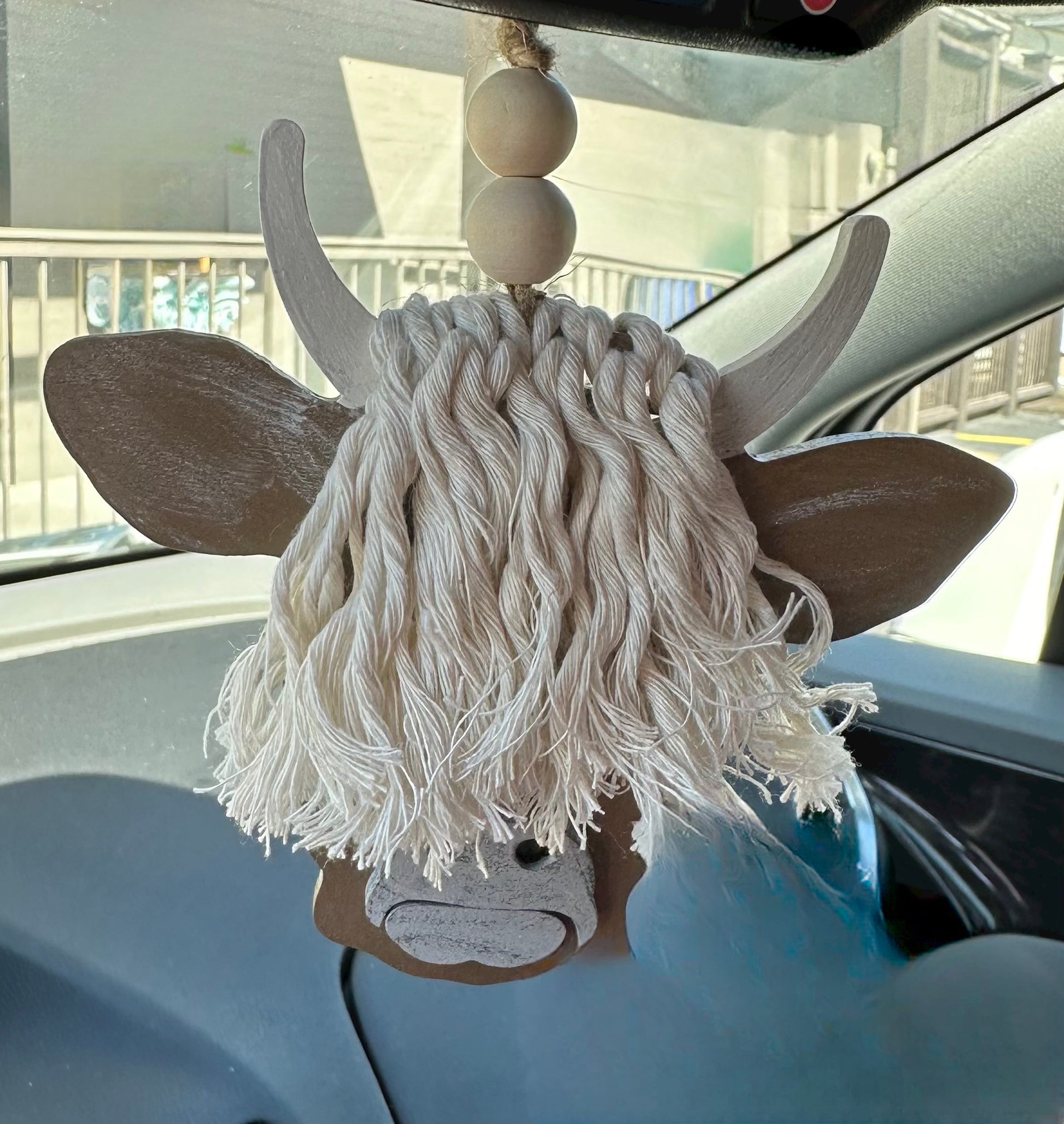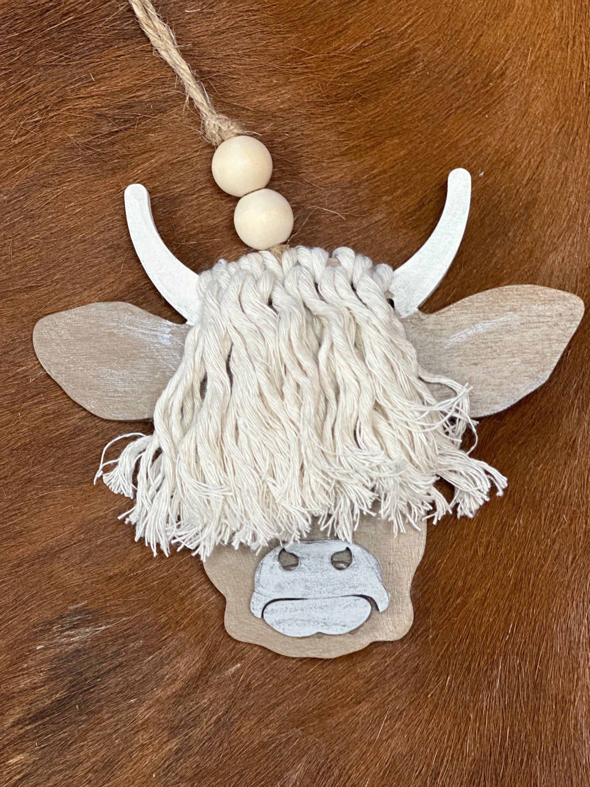 Enhance your car's style with our hand painted Highland Cow Car Charm. Made with a cute and unique highland cow design, this charm adds a touch of personality to your vehicle. Its durable material ensures long-lasting use, making it the perfect accessory. Each one measures 5" by 5" and hangs down approximately 6" with two wooden beads for added decoration.