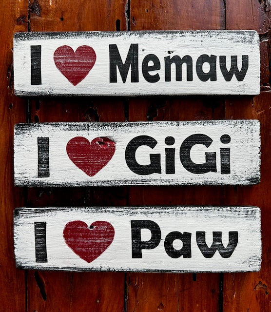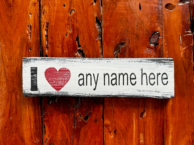 Handmade white distressed shelf-sitter with black lettering and a red heart just for the one person special to you or your family. This I Heart Sign adds a personalized touch to any home decor. Signs are 2.5 x 10" handcrafted with care. Customize these with any name or favorite area making it a perfect gift or addition to any room. Show your love in a unique and charming way.