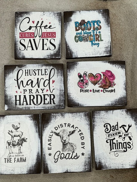 Create a rustic and charming atmosphere with our Small Hand Made Distressed Signs! Each sign is carefully hand made and features a western, farm, cowgirl or positive/Christian theme. Perfect for adding a touch of personality to your home or office. Embrace the beauty of imperfection with these unique, one-of-a-kind signs. Measures 4 x 6"