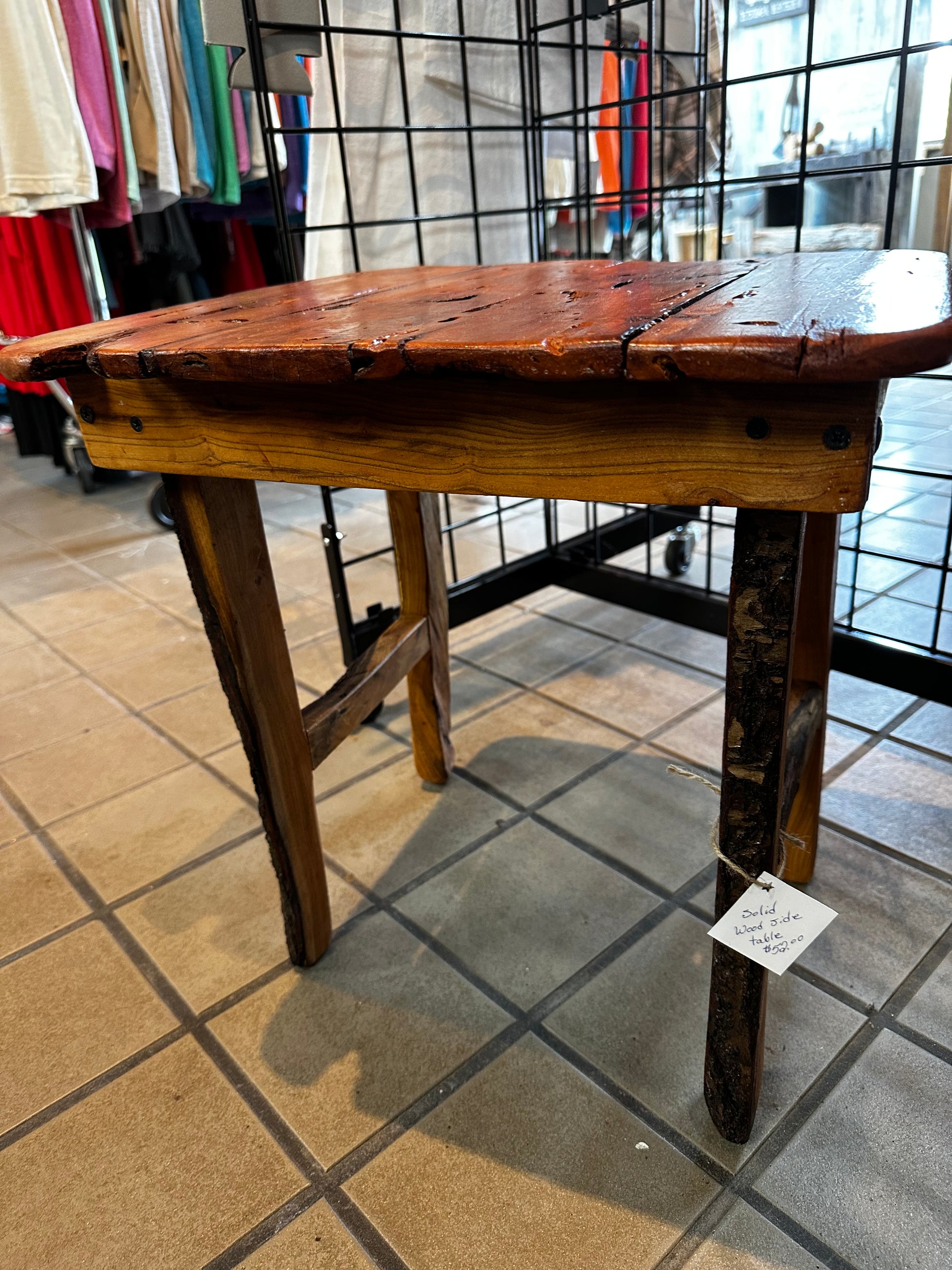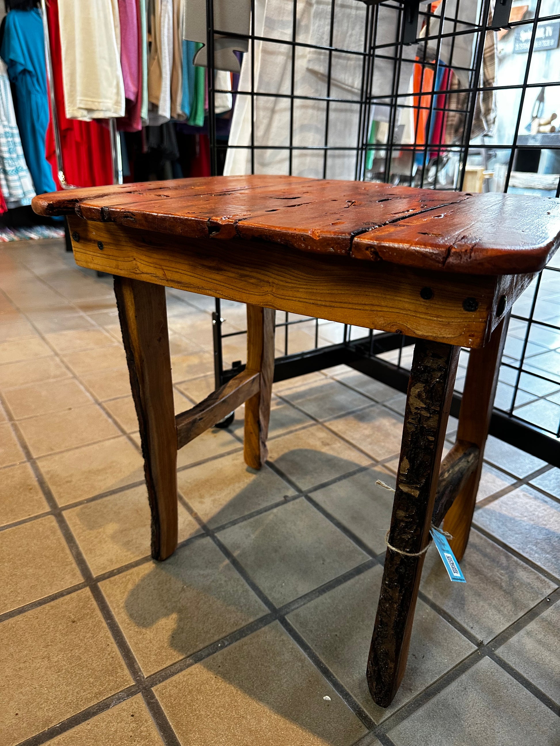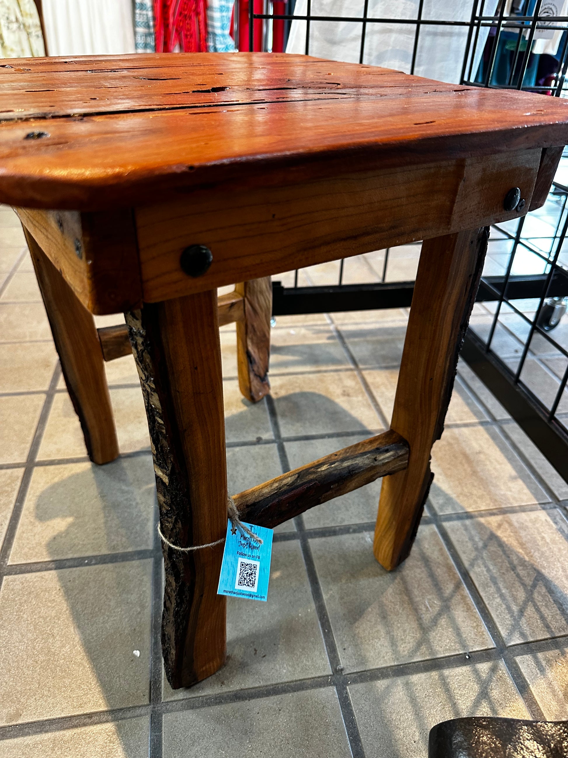 Elevate your living space with our one-of-a-kind handmade side table crafted from beautiful Redbud wood. Each piece is truly unique, adding a touch of natural elegance to your home. Experience the beauty of nature with this stunning and functional addition to your decor. Measures 17" x 15.5", 17.5" H